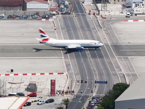Es conocido que en Gibraltar no caben muchas infraestructuras, y si tienes que construir una autopista y un aeropuerto… …lo mas probable es que se crucen. Y efectivamente, la autopista de Gibraltar que va de una punta a otra, tiene un paso a nivel para que despeguen y aterricen los aviones. ¡Imagínate si te lo saltas!