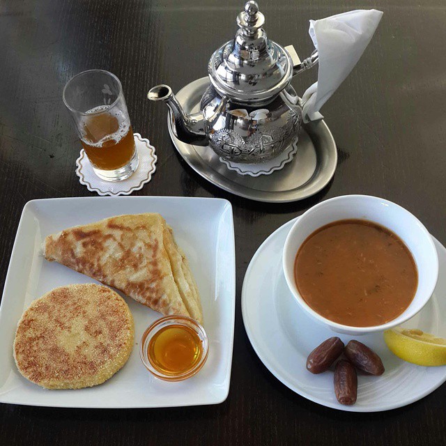 Tradicionalmente se compone de diversos tipos de pan (no es de extrañar que Marruecos sea el país donde se come más pan del mundo: ¡más de 100 kg por persona y año!) con conservas agridulces, mermelada, queso o mantequilla. También podrás encontrar el Baghir, una especie de crepe al estilo bereber para acompañar miel o almendras, ¡el dulce manda!