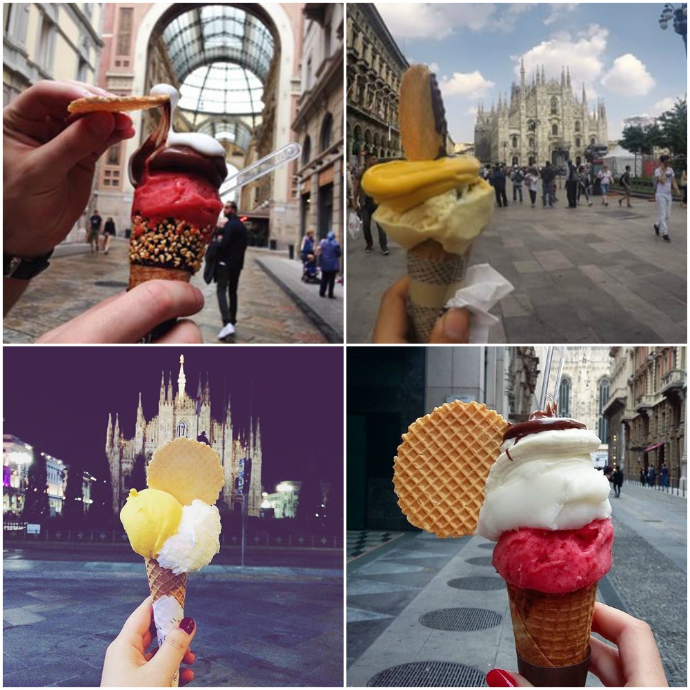Un helado de Cioccolat Italiani frente a Il Duomo, en Milán. Italia es sinónimo a helados… y Milán lo es a calidad. Ambos conceptos se unen en Cioccolat Italiani, una de las cadenas de helados con más savoir faire de la ciudad. Tanto, que es común encontrarse colas larguísimas en su tienda al lado de la catedral. Tan común como ver Instagram, Twitter y Facebook hirviendo con fotos de manos que helados que te hacen la boca agua… No son selfies, pero es que sacar una foto así es éxito seguro en Instagram: